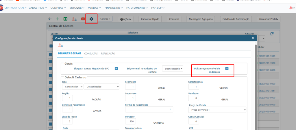 Na Central de Clientes > Engrenagem de Configurações > Marcar a opção Utiliza Segundo Nível de Endereços.