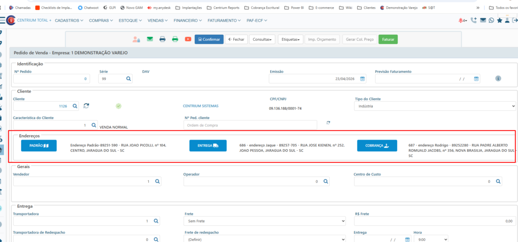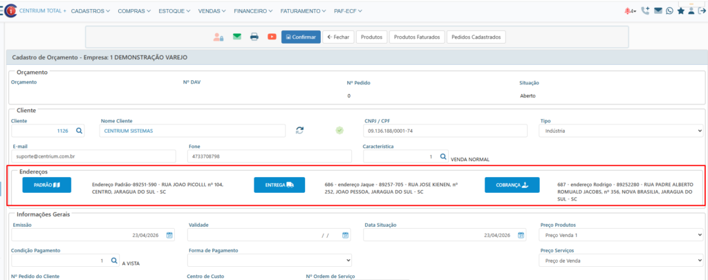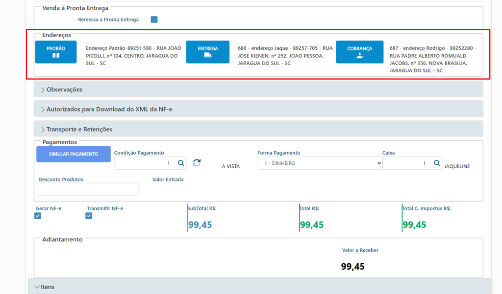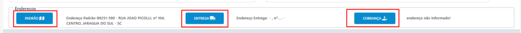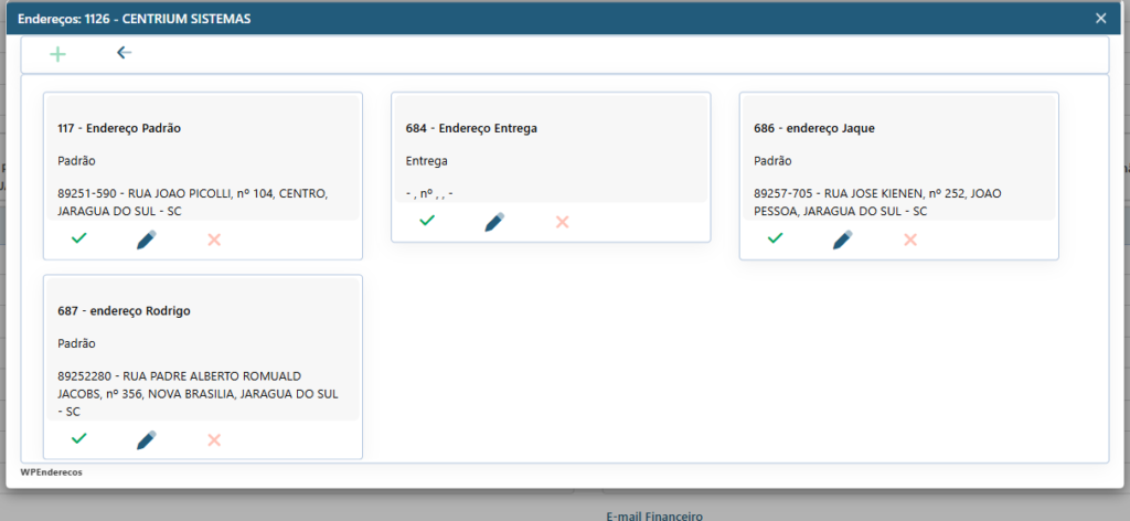 Ao clicar nos botões é possível ver os endereços cadastrados, no + é possível incluir novo endereço, e em cada endereço é possível editar e excluir desde que o mesmo não tenha sido usado em nenhum documento do sistema.