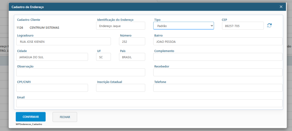 Ao clicar para adicionar um novo endereço, preencher a Identificação do endereço, o Tipo dele e os dados do endereço, caso ele seja do tipo Entrega, preencher também os dados do Recebedor.