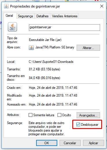 No arquivo gxprintserver.jar > Clicar com o botão direito do mouse > Propriedades > verificar se o arquivo está bloqueado, se sim marcar a opção desbloquear e aplicar/salvar conforme imagem abaixo.