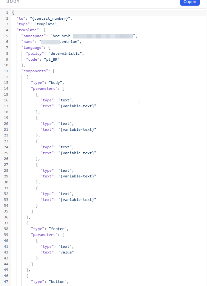 - Preenche os parâmetros do template (ex.: valor, vencimento, chave Pix/QR Code).