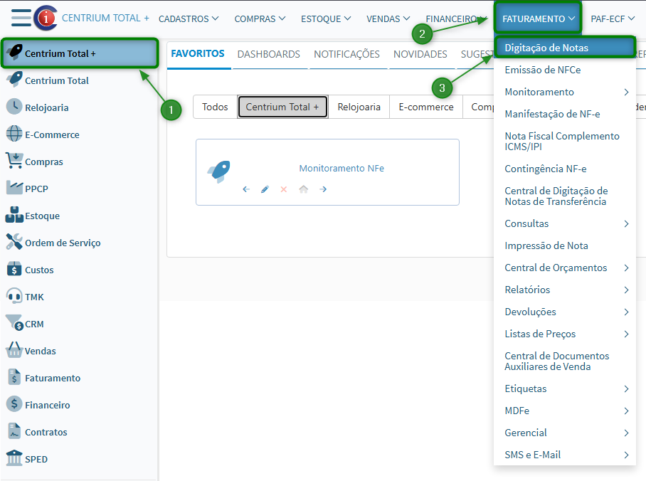 Acesse Centrium Total + > Faturamento > Digitação de Nota e clique no botão “Importar Documento”.