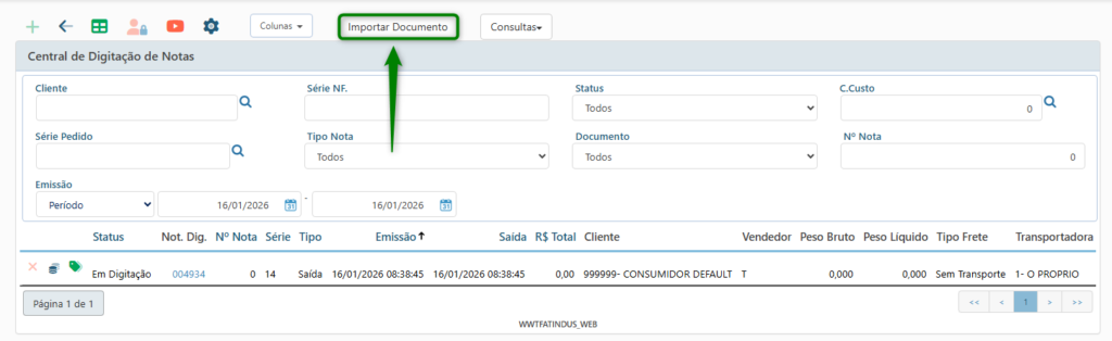 Ou no módulo Faturamento > Faturamento> Digitação de Nota e clique no botão “Importar Documento”.