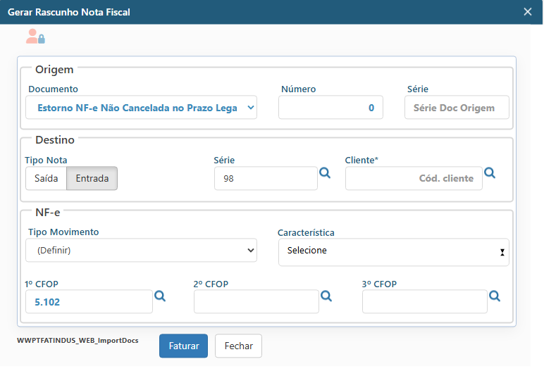 - Documento: selecionar o tipo “Estorno NF-e Não Cancelada no Prazo”.
