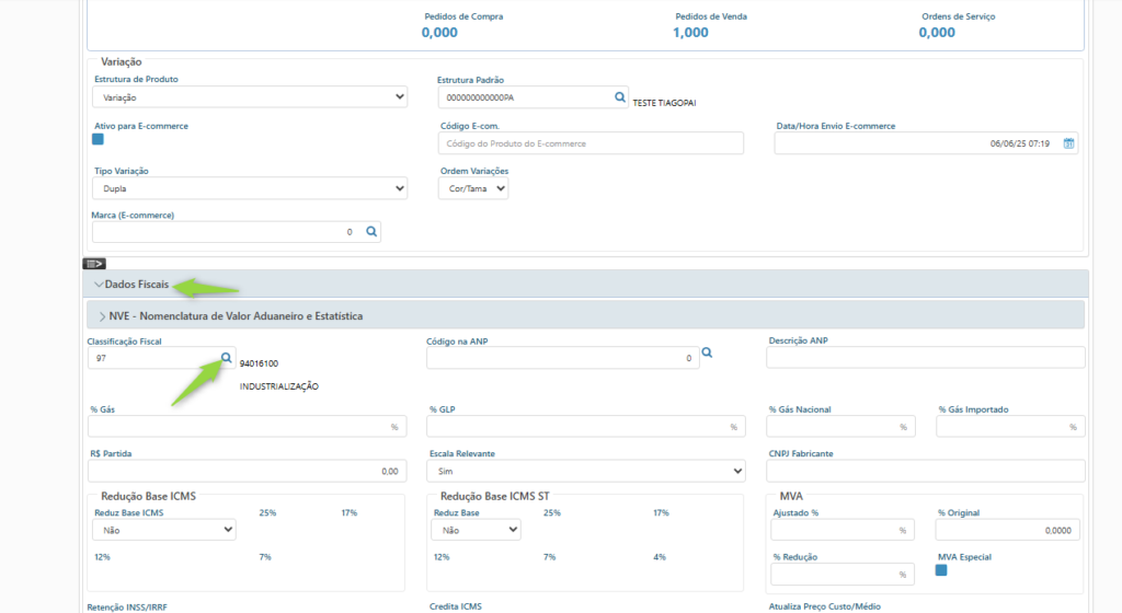 3. Entrar no cadastro do produto e ir até a aba “Dados Fiscais”