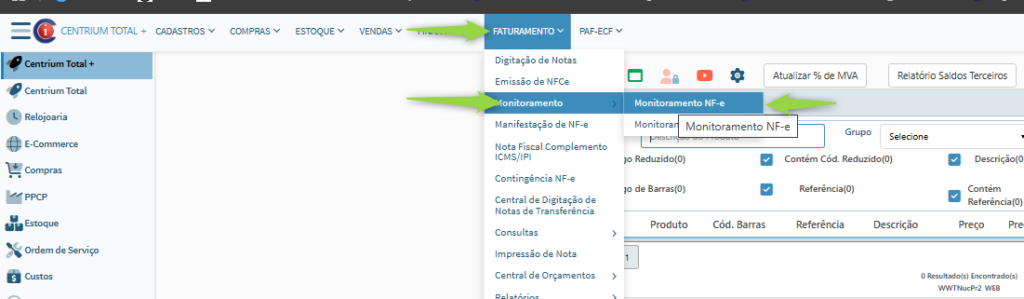 1. Centrium Total > Faturamento > Monitoramento NFe