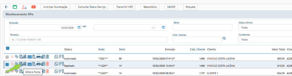 2. Localize a nota com status Não Autorizada ou Rejeitada