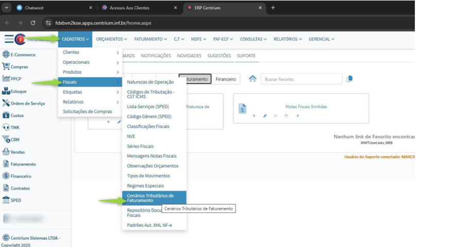 - Centrium Total+ – a partir da versão vigente com módulo fiscal habilitado