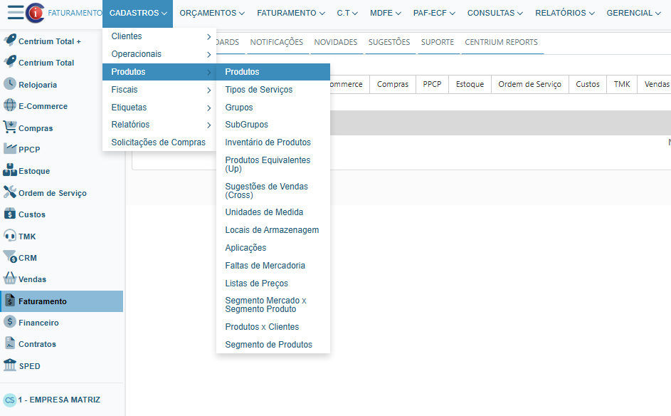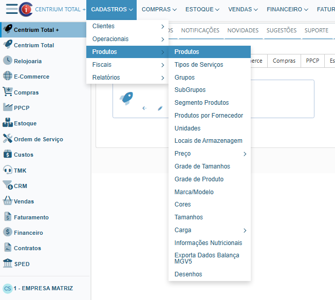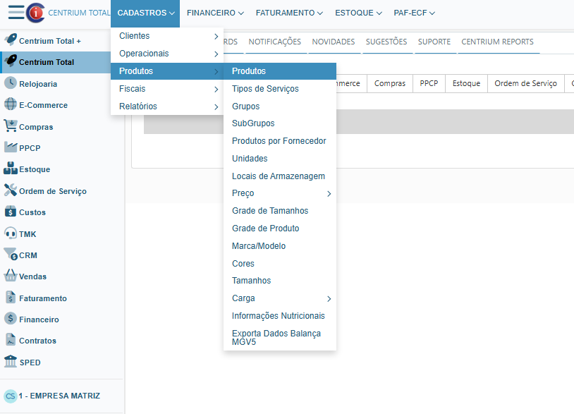 - Centrium Total+: Cadastros → Produtos → Produtos