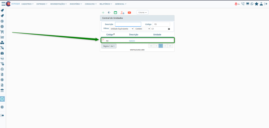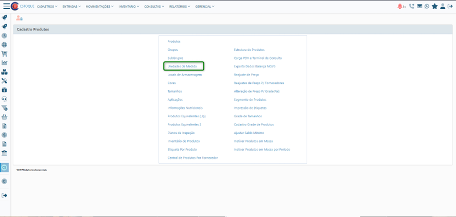 Estoque -> CADASTRO → PRODUTOS → UNIDADE DE MEDIDA
