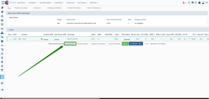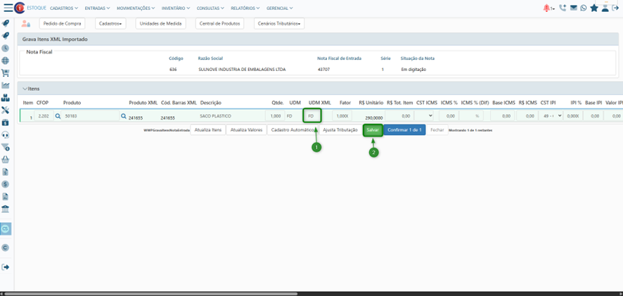 Depois de cadastrar a unidade de medida no sistema, volte à tela de importação do XML.