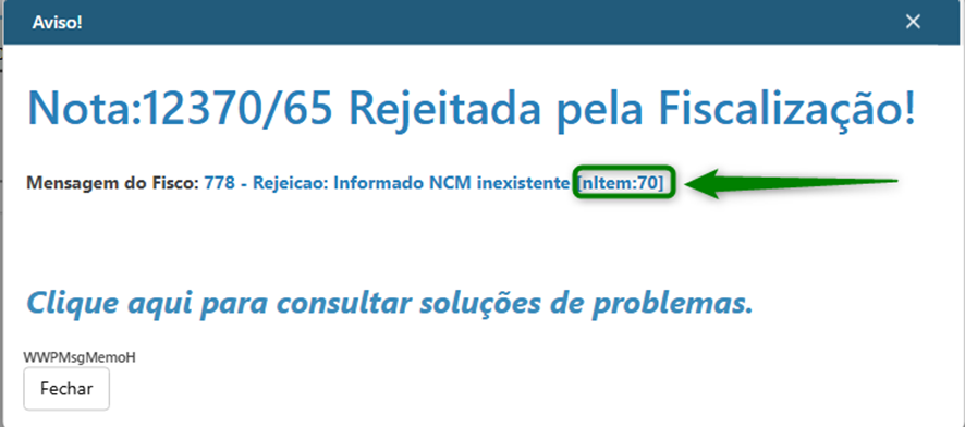 Logo após essa mensagem, o sistema indicará em qual item da nota o erro ocorreu, conforme exemplo abaixo.