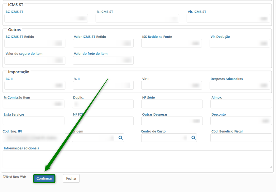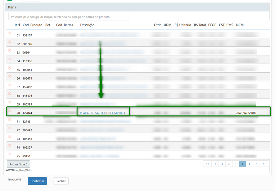 Após identificar o item, aceda à capa da nota fiscal, localize o item indicado e abra-o para edição.