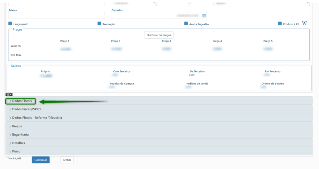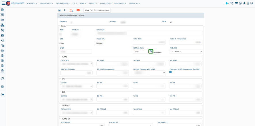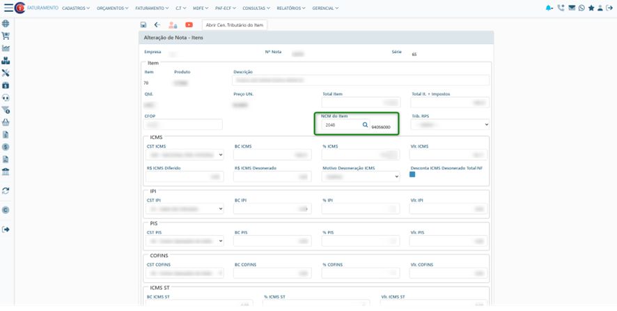 Dentro do item selecionado, verifique o NCM atualmente informado.