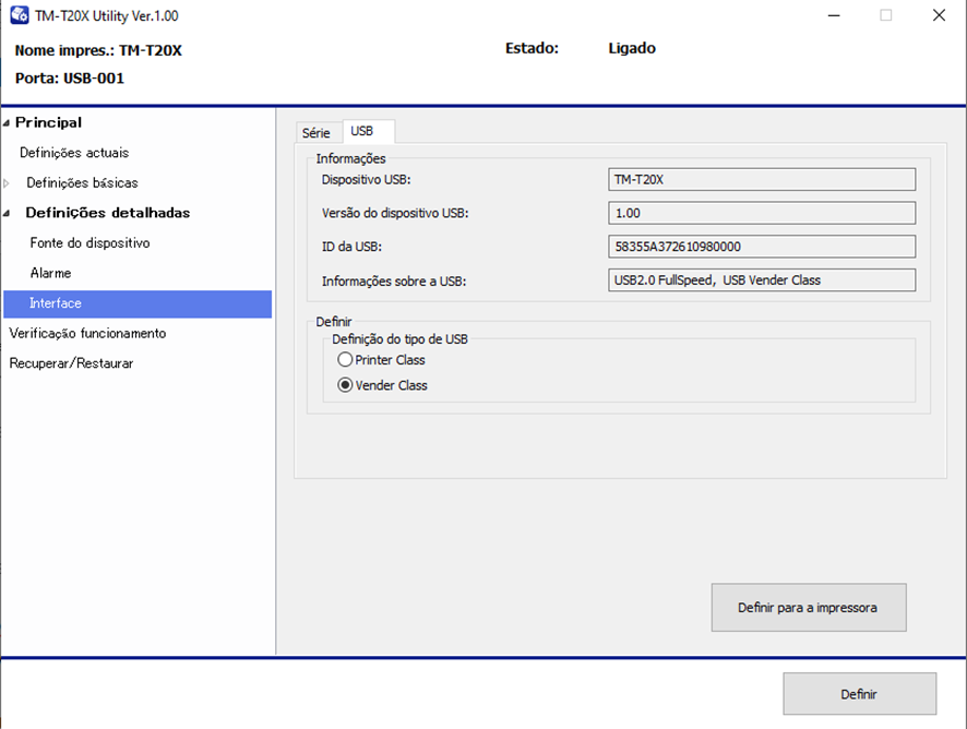 3 – Em Definições detalhadas > Interface, selecione a opção Vender Class e clique em Definir para a impressora e depois Definir.