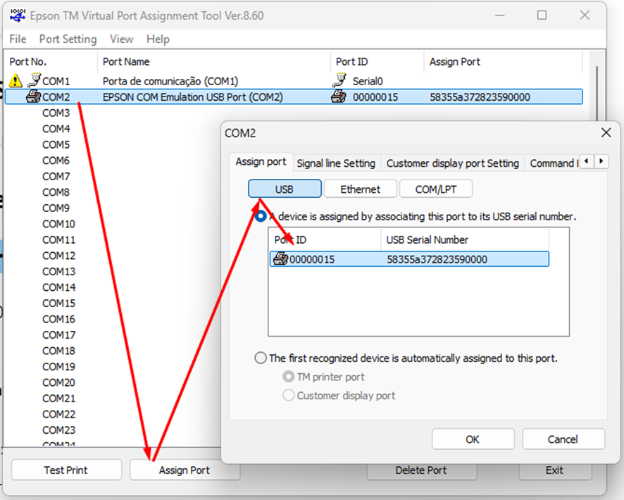 Selecione a porta, clique em Assing, após clica no USB e selecione a impressora instalada. Está configuração serve para emular uma Porta serial na conexão USB e então conseguir conectar ao novo servidor 3.0.