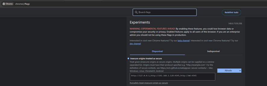 Aba o Chrome e vá no link “chrome://flags/”. Procure por ” Insecure origins treated as secure”, ative e adicione os IPs ou nomes da máquinas seguida da porta, e adicione o “http://127.0.0.1” juntamente. Após reinicie o navegador.