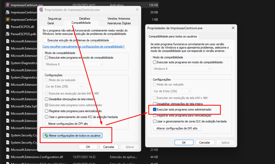 Altere as propriedades do executável “ImpressaoCentrium.exe” para executa-lo sempre como Administrador.