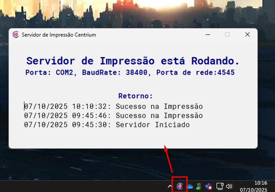 O aplicativo fica rodando em backgroud com seu ícone de acesso no tray do windows. Ao abrir o tray será exibido a porta de rede e a conexão COM que o servidor está rodando, e a cada impressão será exibida a mensagem de sucesso ou falha com a mensagem de erro.