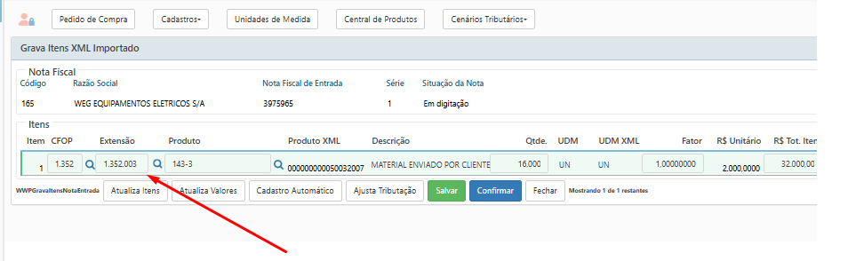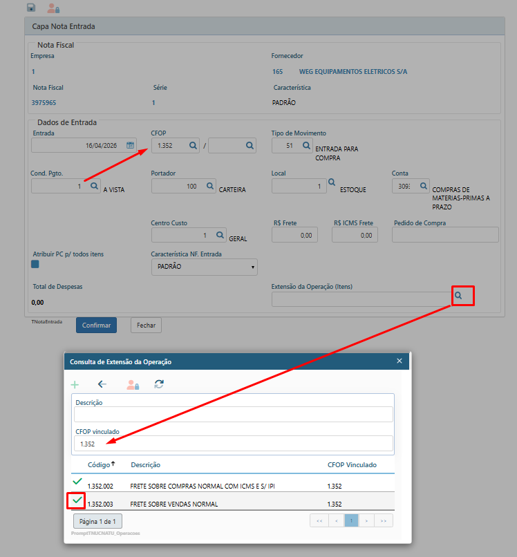 - Na engrenagem da nota de entrada marcar a opção Extensão da Operação (0400).