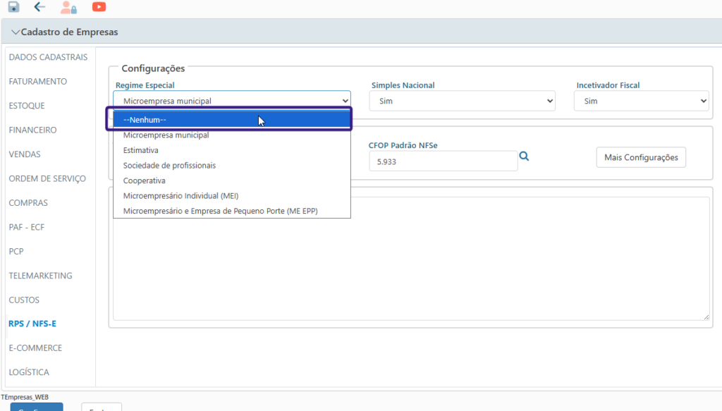 Obs: Quando o cliente tem o regime do Simples. Nacional, validar se possui regime especial de tributação ISSQN na prefeitura. E configurar no cadastro de empresa. Na aba de RPS/NFS-E o regime especial para “Nenhum”
